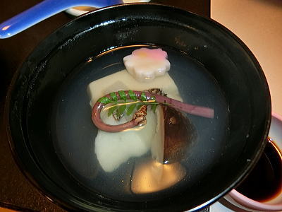 先付・桜豆腐 新筍の木の芽和え 鮎甘露煮と