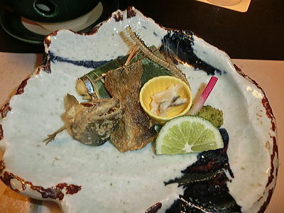 | 焼き物 山女魚の葉田楽 骨煎餅 数の子明太子 |