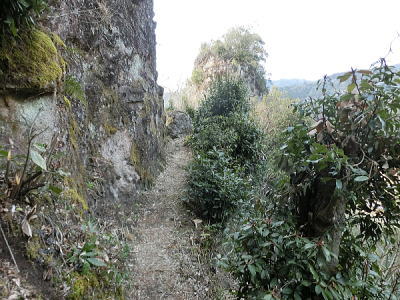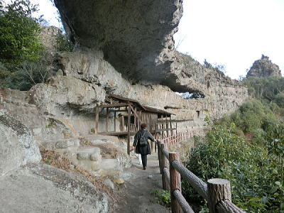 青の洞門近くの不思議な山容、お連れさん「行ってみたい」と古羅漢寺探勝道と