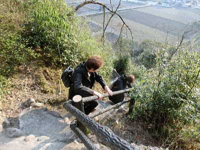 | 山頂大岩ぐるり鎖が、鎖をもって慎重に |