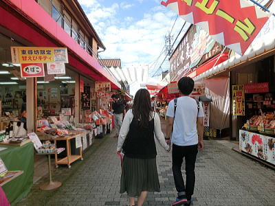 街道両脇は鯖寿司やみたらし団子、お土産店が