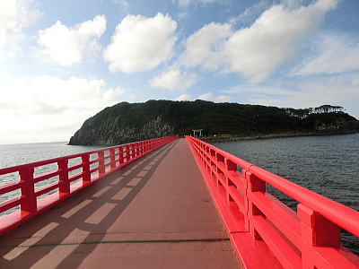 朱塗りの大橋をわたり石段を登ると、歴史の古い神聖な大湊神社をはじめ島の上は神秘的な雰囲気。約1キロある