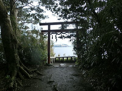 鳥居の両脇に狛犬・・一見ごく小さな島ですが、橋を渡ると