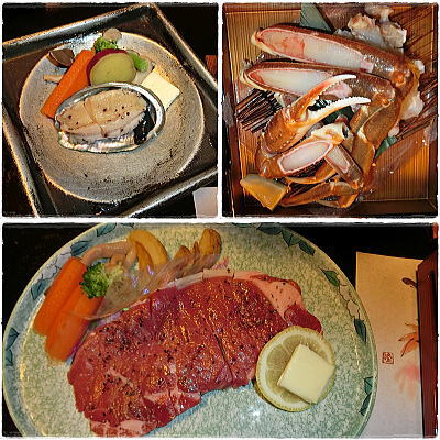 3種類を3人でシェアします。 特選牛ステーキ・焼きガニ