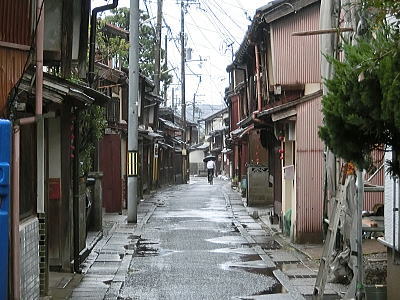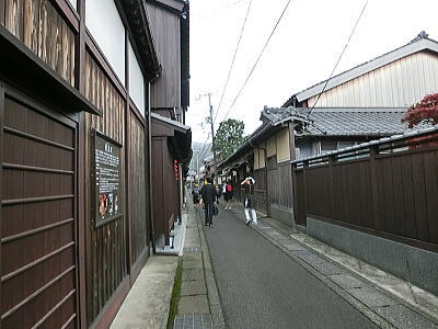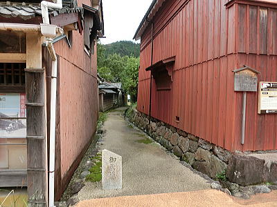 御蔵道・熊川宿が設けられるとともに、年貢米を貯蔵するため、小浜藩では現在の松木(まつのき)神社境内に土蔵12棟を建て年貢米3万俵を収納していました。この蔵屋敷と川船運行が行われた北川をつなぐ通路として利用されており、重きをなしていたためか御蔵道の名前が付いています。板塀や石垣、水路と調和して情緒ある路地になっていました。 |