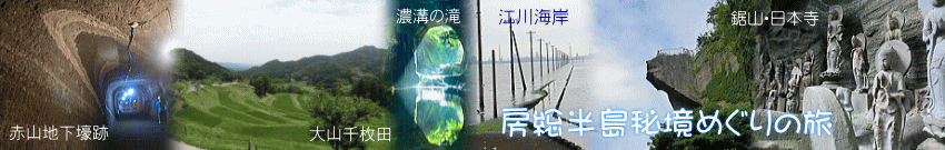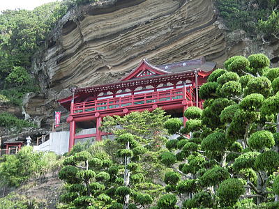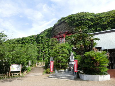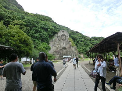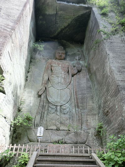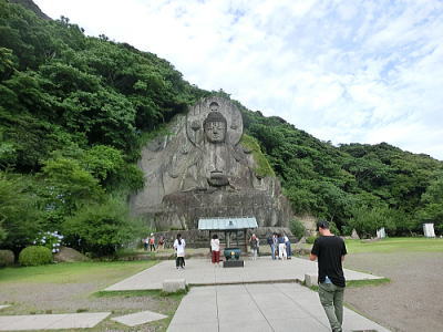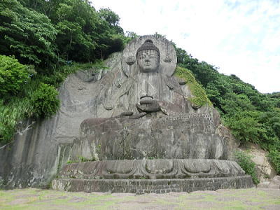 百尺観音(30m)・・昭和36年5月から、6年の歳月を費やして完成した大観音石像です。鋸山山頂に切り立つ、険しい崖に囲まれた雄大な景勝地に安置された大観音像。発願の趣旨は、一つには世界戦争戦死病没殉職者供養のため、また一つには、近年激増する東京湾周辺の航海、航空、陸上交通犠牲者供養のためだそうです。 |