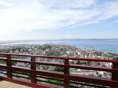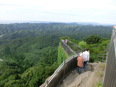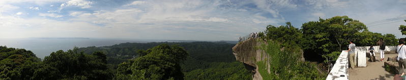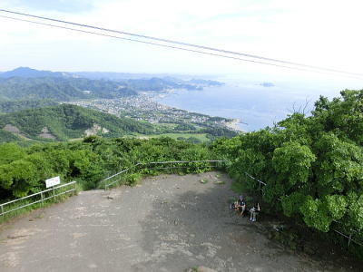 | 山頂からワイドで周囲の山々と東京湾を望む。 |