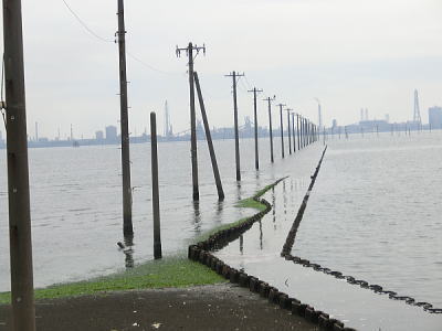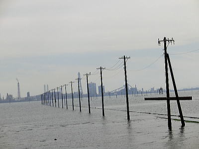 潮干狩りで有名な海岸です。陸上から海に向かってぽつんぽつんと電柱が立つ不思議な光景が広がっています。 |