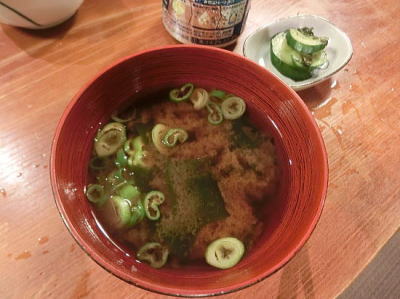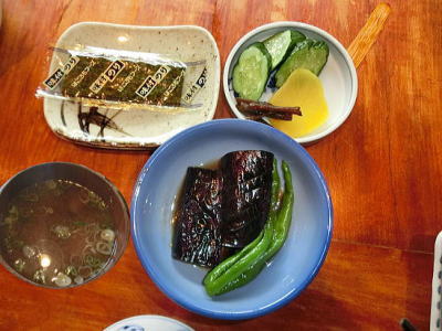 6時からの夕食です。 みょうが・イカ・ピーマンの味噌和え