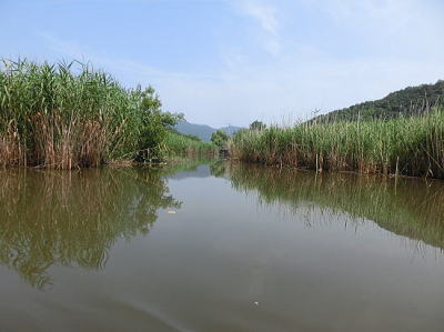 ヨシの中を進んで行きます。ヨシの壁に沿ってどんぶらこどんぶらこと進んでいきます。