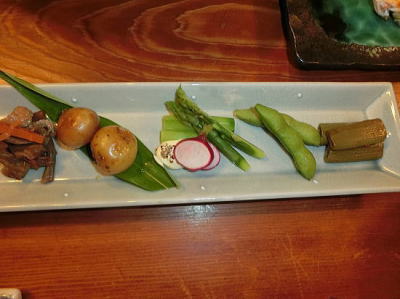 | 左)ズイキ・じゃがいも・アスパラ・枝豆・イタドリ |