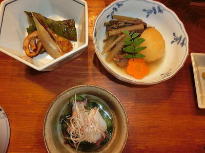 蛸と胡瓜の酢の物蕗、わらび、じゃがいもの煮物 |