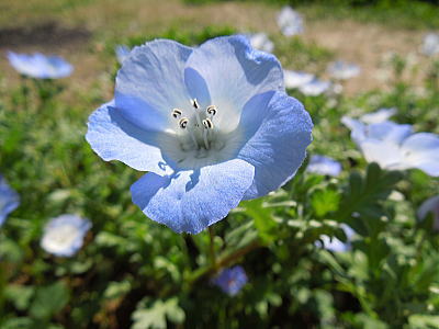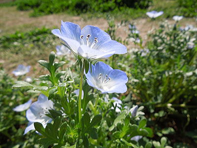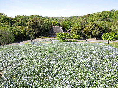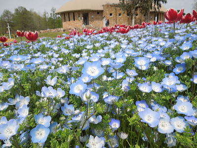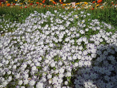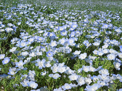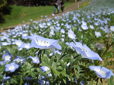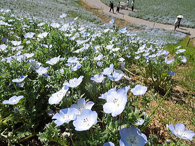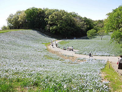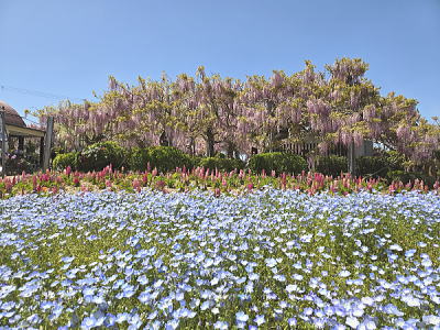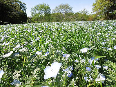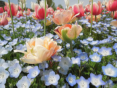 | チューリップが咲く花壇はネモフイラで埋め尽くされています |