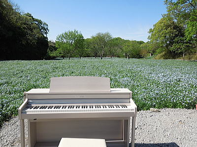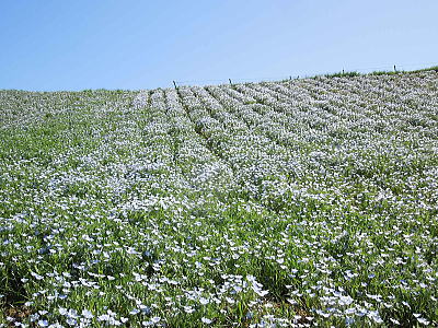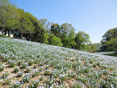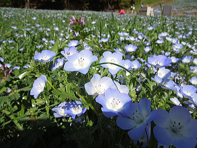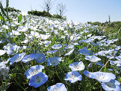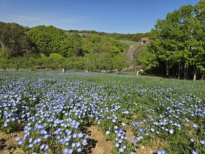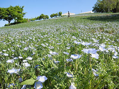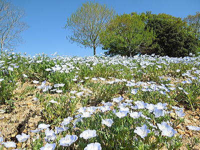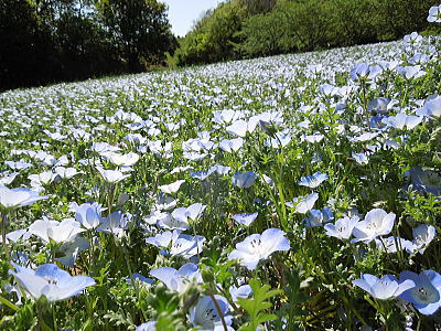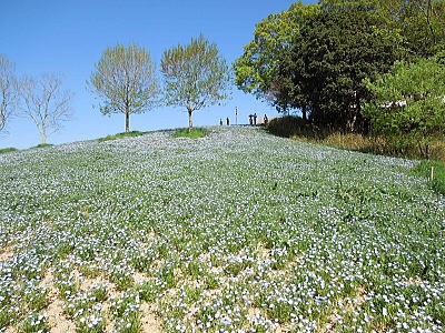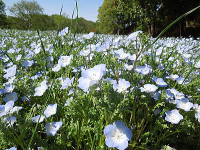 | ポプラの丘に咲く、チューリップとネモフイラ、どちらも最高の見頃 |