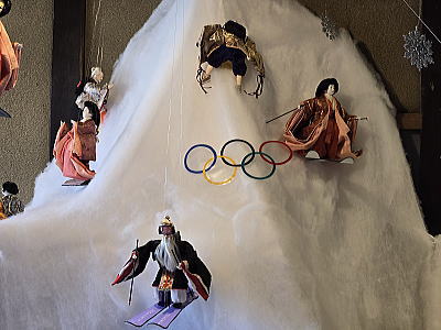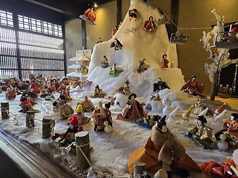 | 雪山を上るリフトのほかスノーボードやそり滑りを楽しむ雛人形が勢ぞろい |
