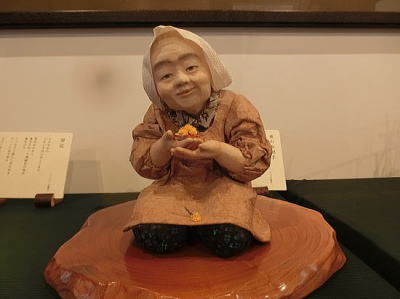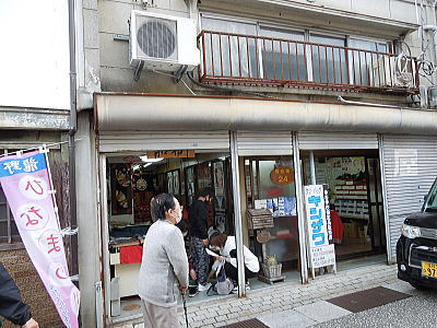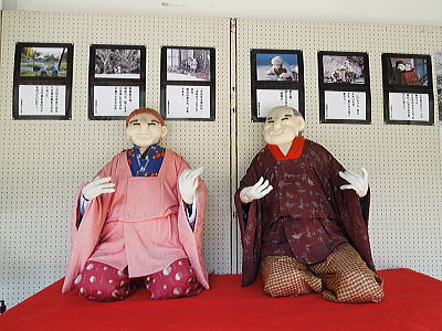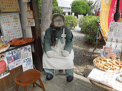 ハンコ屋さんのお店前に案山子のおばさんと