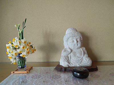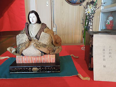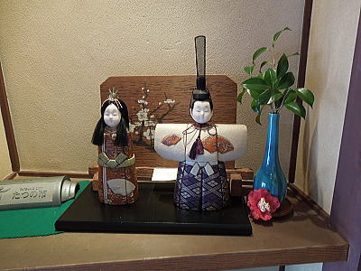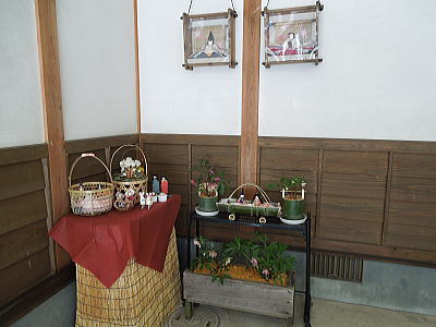 玄関を入ると御殿雛とスイトピー