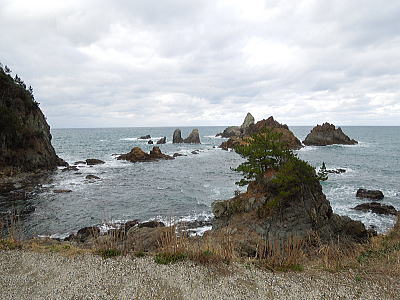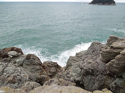 溶岩や火砕岩が浸食された小島が磯に浮かんでいます