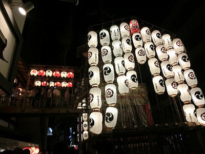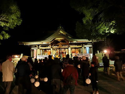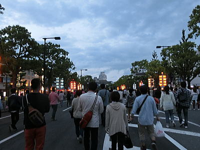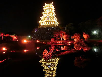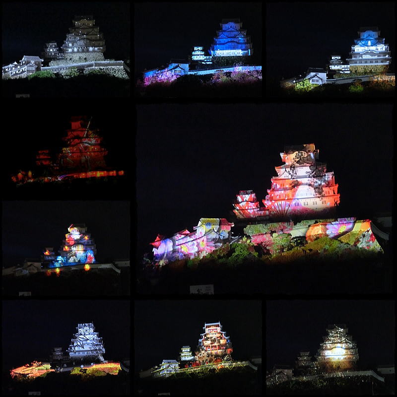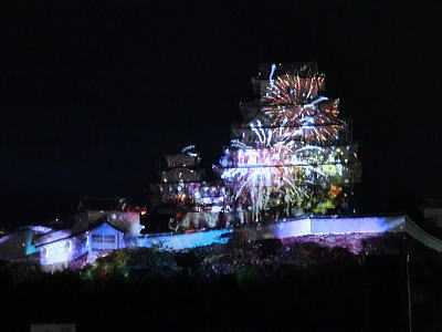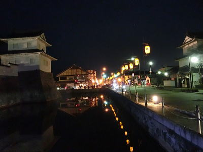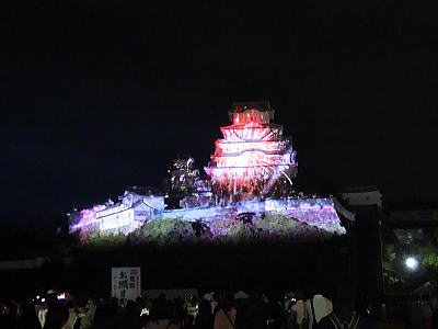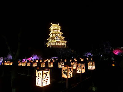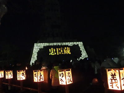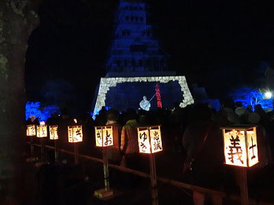 城内には行燈とともに赤穂城がきらめいています。 |