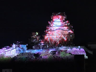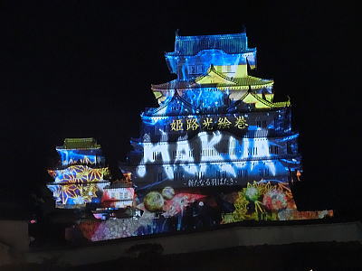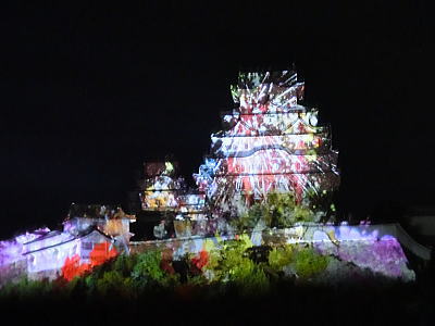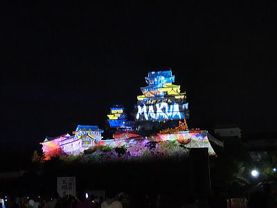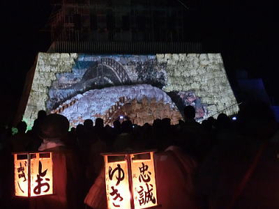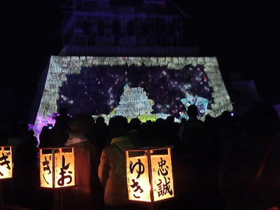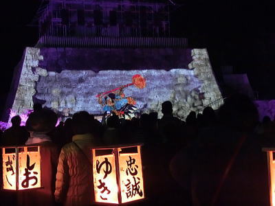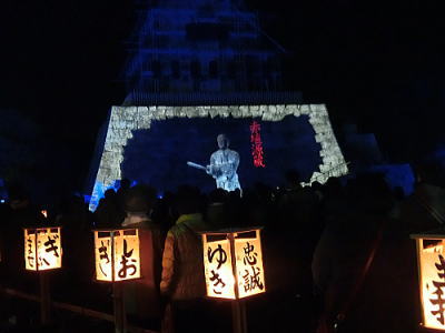 2015年12月13日 赤穂城跡天守台の石垣に忠臣蔵の浮世絵投影が12日・13日に上映されると知り行ってきました。映像は縦約9m・横約17mの石垣に投影されます。荘厳な音楽とともに鮮やかに描かれた義士らが登場。CDでで作られた屋敷や橋を舞台に、刃傷事件から討ち入りまでが再現されます。