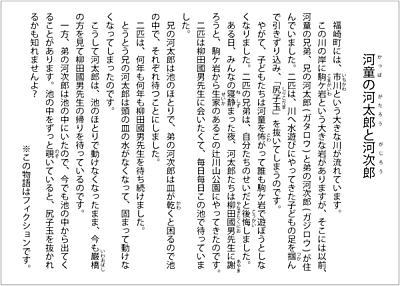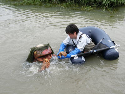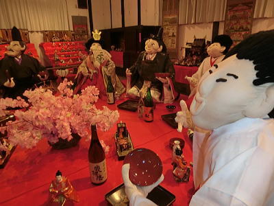 | 今日の出し物は【戎舞】・戎さまは今では商売の神様になっていますが、もともとは海の神様でした。淡路島では昔から漁村のお祭りで浜芝居が行われ、間狂言として大漁や航海の安全を祈って必ず舞われていたのが【戎舞】です。戎さまが、釣竿をかついで淡路人形座へやってきました。庄屋さんはお神酒をだします。杯を飲み干した戎さまは、自分の生まれや福の神であることを話しながら舞いはじめました。海の幸、山の幸を前に、皆の願を叶えようと、お神酒を飲み、幸せを運んできます。酔った戎さまは船に乗り沖に出て、大きな鯛を釣り、メデタシ、メデタシと舞い納めるのです。太鼓のリズムに合わせて、楽しく舞う戎さまを見ていたら、幸せな気持ちになってきました。 |