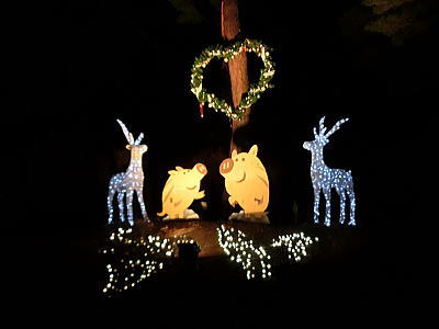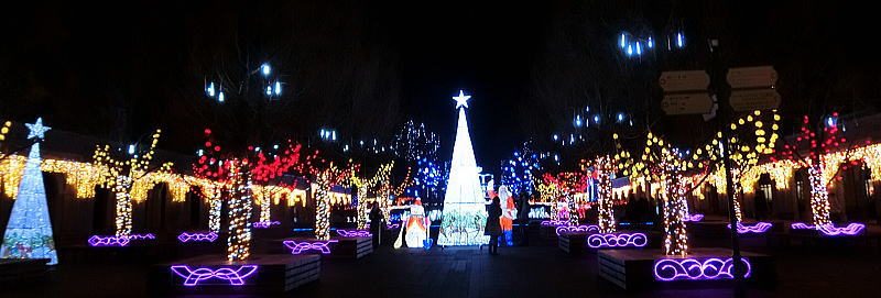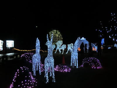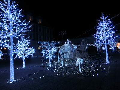 これまでのブルーやピンクやグリーンのカラフルなイルミネーションとはうって変わって、華麗な白銀の世界が広がります。白亜の建物に、白銀の木々、トナカイや馬車も白銀です。 |