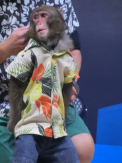 神戸モンキーズ劇場で光のモンキーショーが・・・無料ですがおひねりがいります。紙のほうが希望だそうです。 |