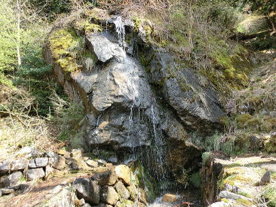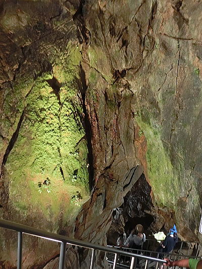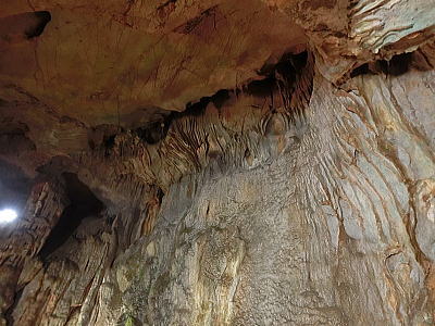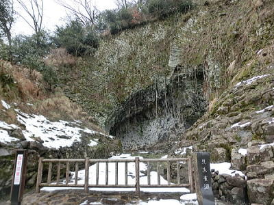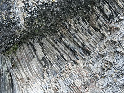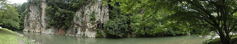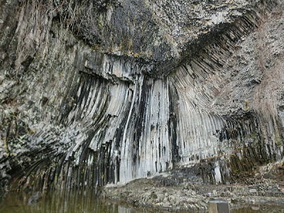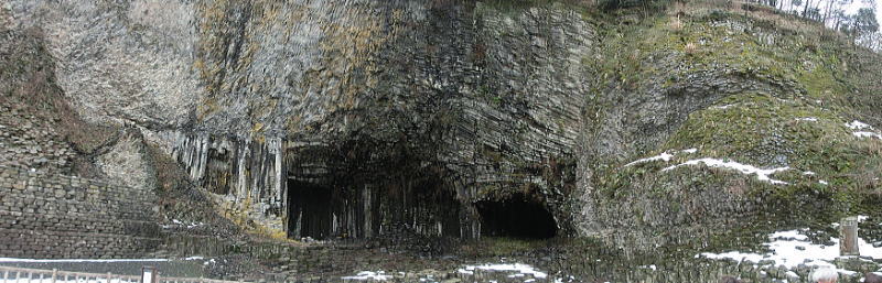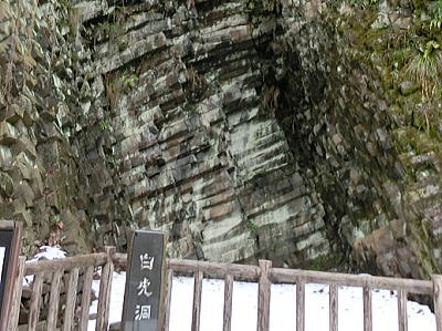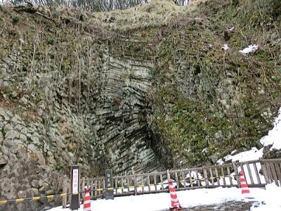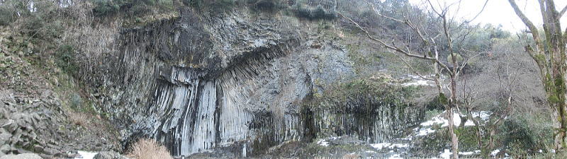 | 横向き節理の美しい白虎洞・・水平方向に伸びた柱状節理の断面を間近で見る事が出来ます。 |