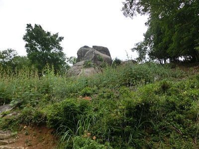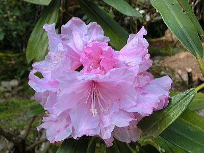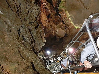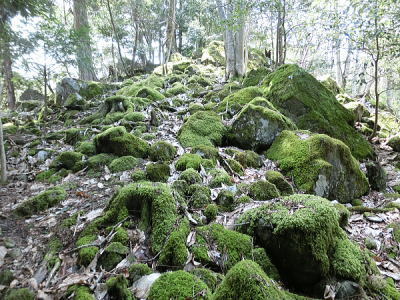 南朱雀洞・・・岩石は節理が見られず表面がごつごつしています。これは溶岩流の先端になる部分で溶岩の表面が固まっても、まだ内部は熱く後から溶けた溶岩が押し出され、表面が破壊されて塊状の岩石になっています。よく見るとガスの抜けた穴が見えます。 |