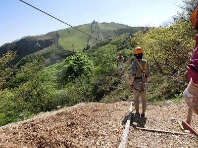 緑の葉が生い茂る中を進むトロッコに