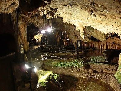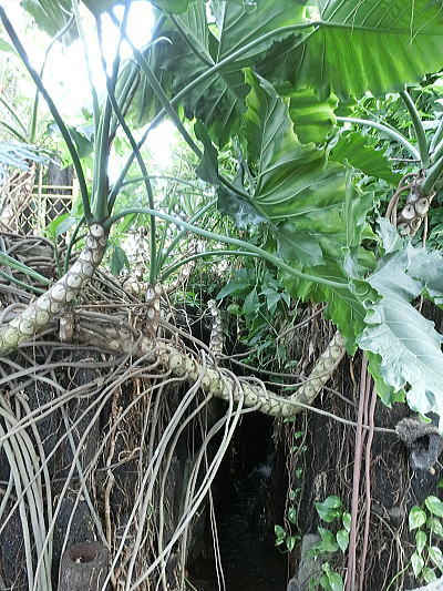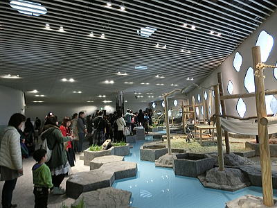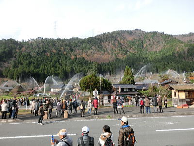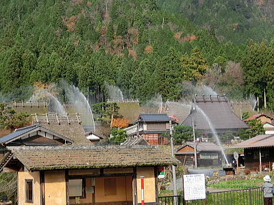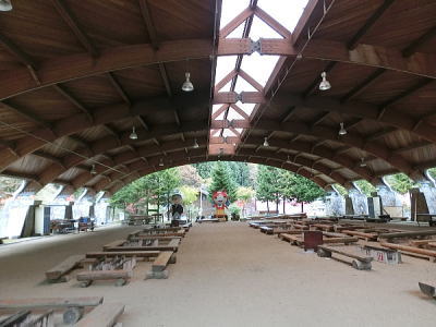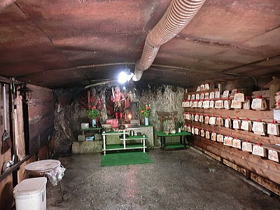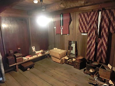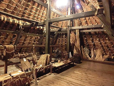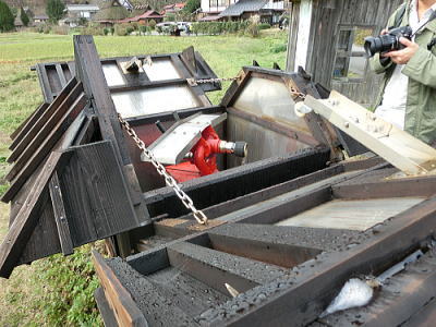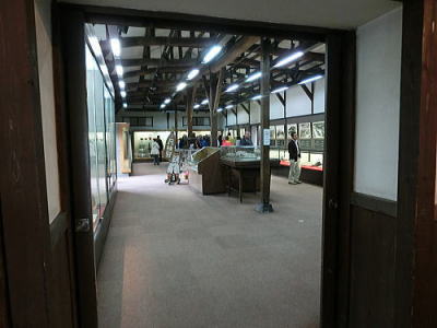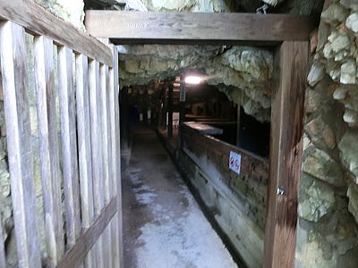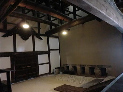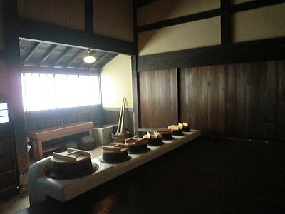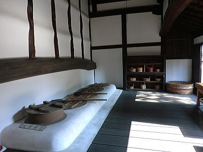 一度に何百人もの食事を一度に調理、配膳することができます。床が斜めになっている為、お米を洗うのはこの場所で、ゴミは隙間に入り水は排水口へと流れます・・壁が波打っているのは、漆喰が湯気で傷まない為とか、70年来使われておりません。 重要文化財になっています。