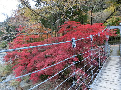 保津峡は、京都を代表する自然美のひとつ。駅を出るとすぐに保津峡にかかるつり橋(鵜飼橋)が見えます。