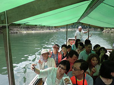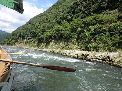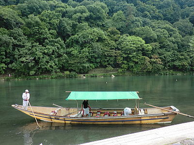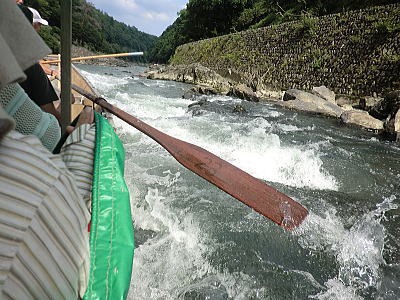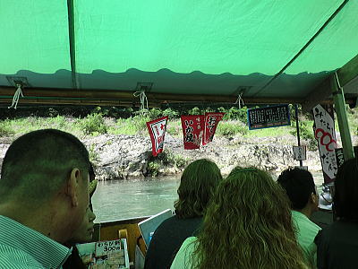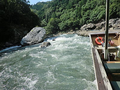保津川下りの船は手漕ぎですが 屋台船はモーターが付いています。お客様がビールやイカ焼き わらび餅などを買っている間、屋形船がピッタリ付いて引っ張ってくれています。 |