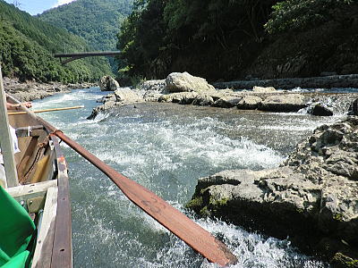 熟練した船頭さんが棹、舵、櫂で操り、岩の間をすり抜けてゆきます。 四季を通じて保津渓谷はそれぞれ趣きをもった