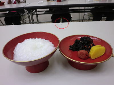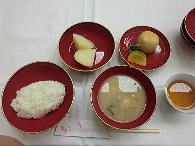 お坊さんが一人ずつおかゆを入れてくれますが、合わせた手を擦り上げると(お粥の量)それで良いと言う合図です。おかずは、たくあん、梅干し、ヒジキの3種だけで、たくあんは一切れは残し、お茶で茶碗と漬物皿をたくあんで洗いお皿を綺麗にして、お茶を飲み干します。ちょっと抵抗がありました。 赤丸の中のお粥はこの世に生きる生物・飢餓に苦しむ者達への為に、とか・・・