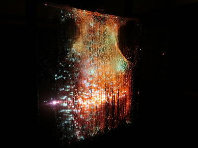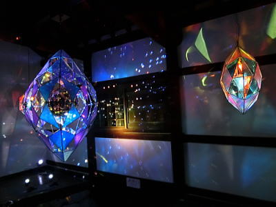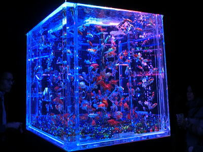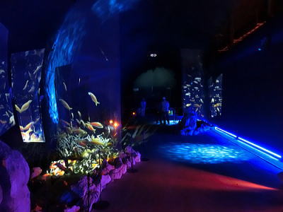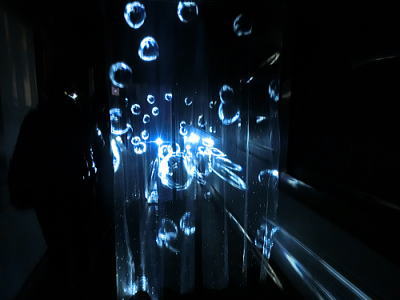 魚の群れを照明の代わりに投射された映像が乱反射してプリズム効果を生む作品になっています。 |