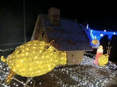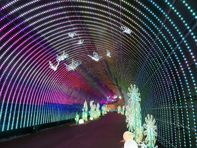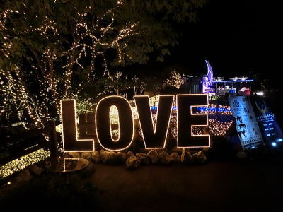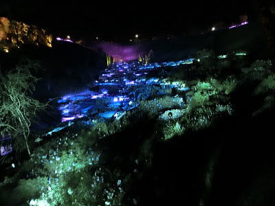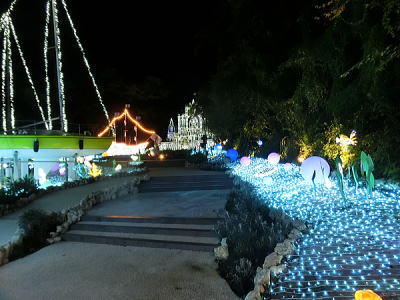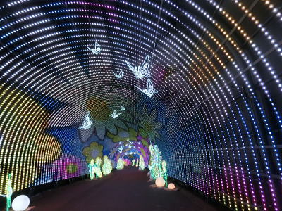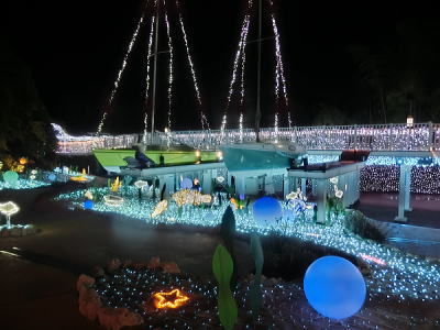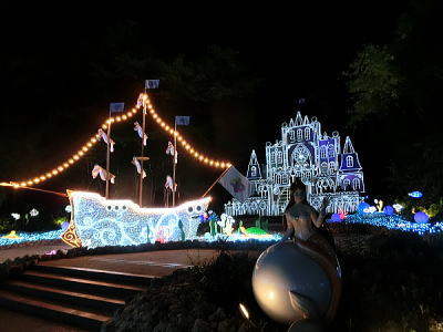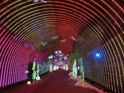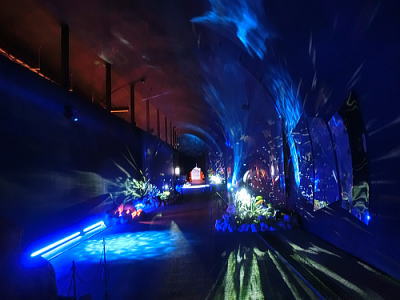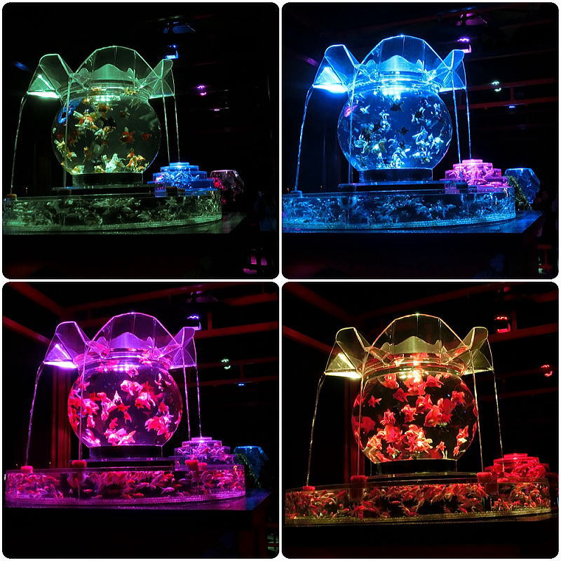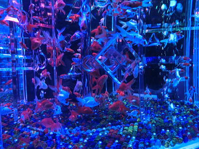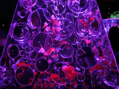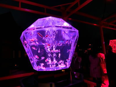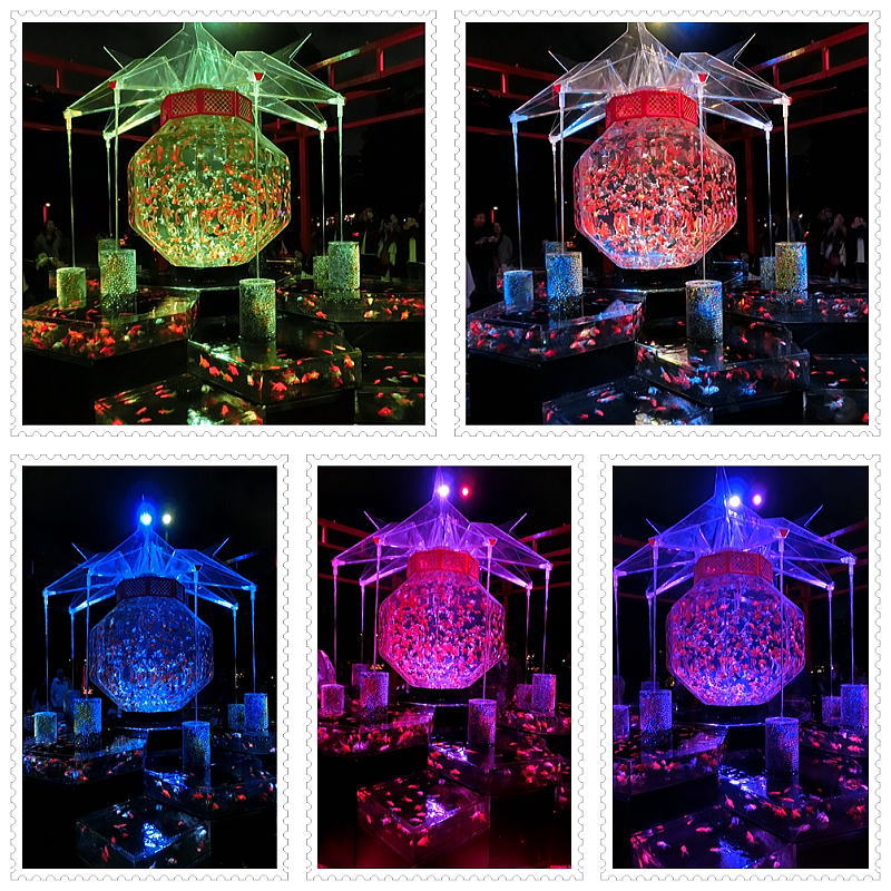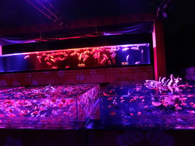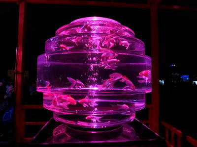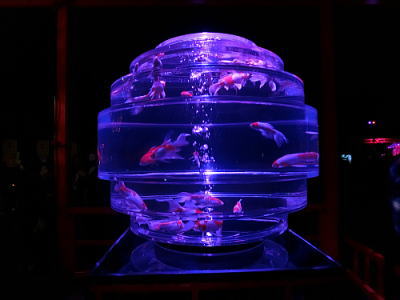 超花魁・・世界最大級の金魚鉢で3000匹の金魚が舞い泳ぎ、七色に輝くライティングと