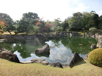 | 二の丸御殿に隣接するように広がるのは国の特別名勝に指定されている二の丸庭園。小堀遠州の手による書院造庭園であり、御殿のどこから見ても美しいように配置された庭園です。 |