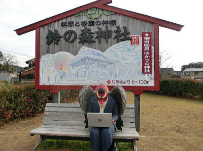 辻川公園のペンチに座る背広を着た天狗