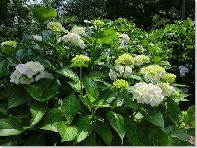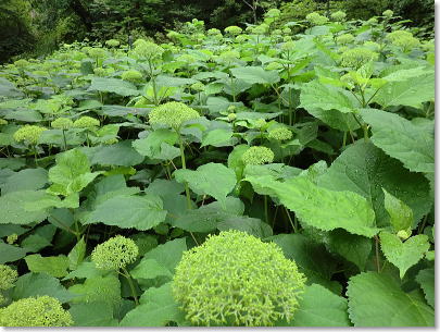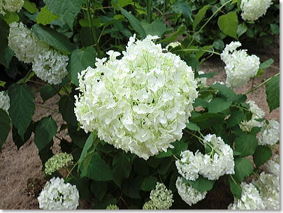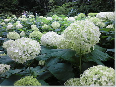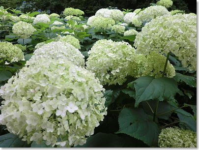 | アナベルの群生・・・花色が緑色から真っ白になり鮮やかであじさいの中でも人気がある品種です。 |