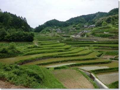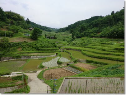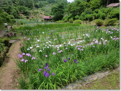 | 乙大木谷の棚田:1000枚の広がりを見せる棚田は、自然の中にたたずむ昔ながらの農村風景で、農林水産省の「日本の棚田百選」に認定されています。毎年2月〜3月にかけて、棚田オーナーを募集しているそうです。(おじいちゃんとおばあちゃんの花菖蒲園、近くの棚田)。 |
