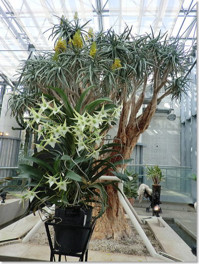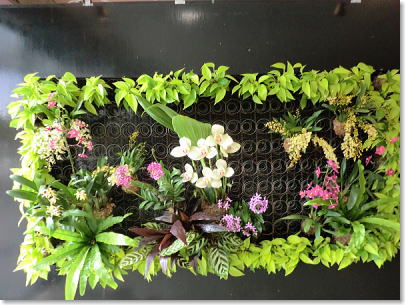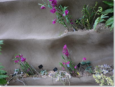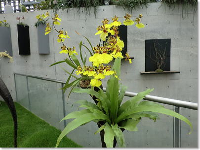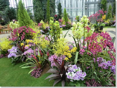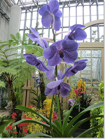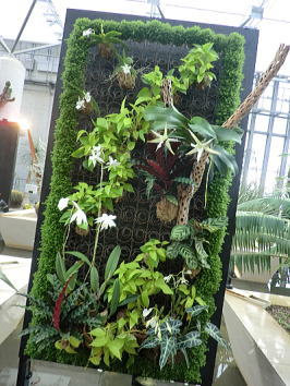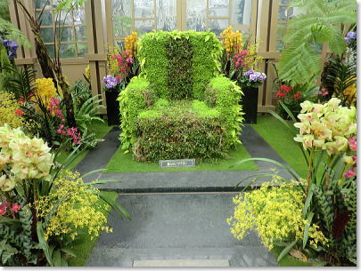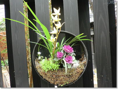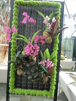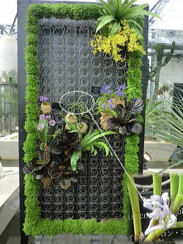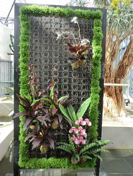 | スタンド仕立て、植物の持つ多彩な色で演出されています。(右端〇世界で3種類しかない青いランが関西初登場) |