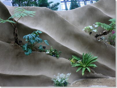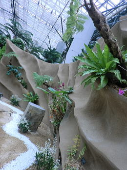 | 展示室E シダルーム 水音の響く洞窟空間、人工の光の下で元気に育つ耐陰性の植物が展示してあります。 |