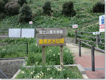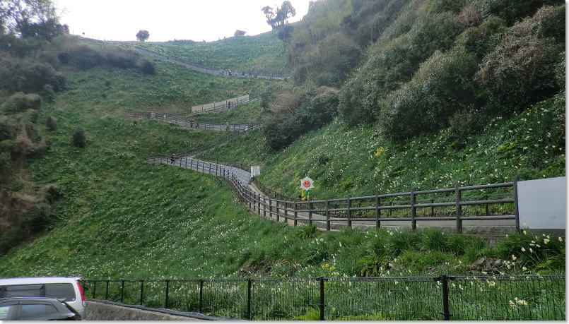 紀淡海峡を望む絶好のロケーションで栽培面積6haの敷地内に300万本もの水仙が咲いています。駐車場が山間の谷にある水仙畑です。前が見えない程のガタガタの坂を下り畑の近くまで行くことができます。 |