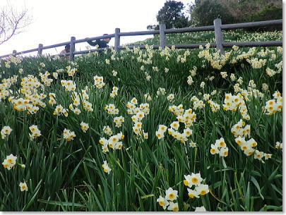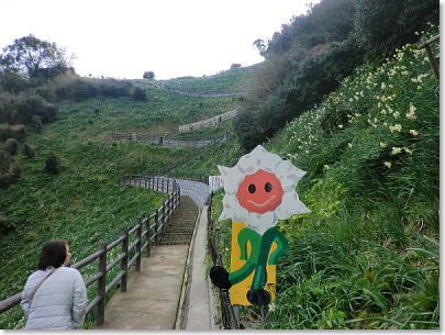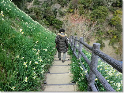 水仙が咲いている道はコンクリートの道です。車いすやベビーカーも、無理なく鑑賞することが出来ますが