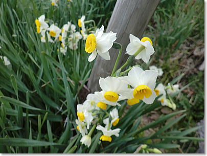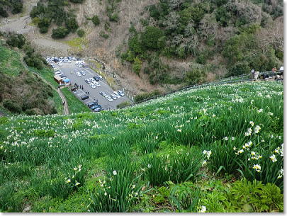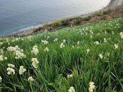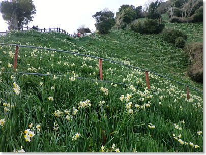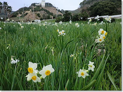 春まだ遠きこの時期に目を楽しませてくれるのは、冷たい風の吹きっさらしをものともせず、急斜面に揺れる水仙の