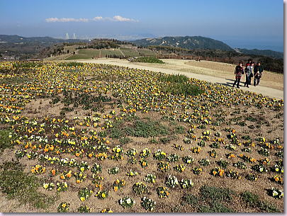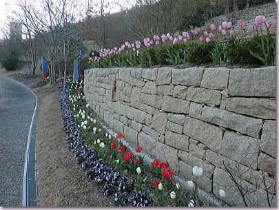| 「あわじ花さじき」は花の島にふさわしい花の名所として、兵庫県が平成10年4月から設置しています。淡路島北部丘陵地域の頂上部、標高298〜235mの海に向かってなだらかに広がる高原に一面の花畑が広がります。(面積約15ha)明石海峡・大阪湾を背景に花の大パノラマが展開し、季節により変わる愛らしい花々が夢の世界に誘います。 時期が少し早かったようです。4月、5月にもう一度訪れたい所です。 |