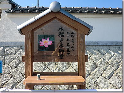 | 本福寺は京都の旧御堂御所と称される総本山仁和寺の末寺で平安朝後期に創建されたと伝えられる古刹です。本福寺の新しい本堂、水御堂は世界的建築家、安藤忠雄東京大学教授設計により平成3年に建立された。この本堂は約2千年以前の古代ハスや睡蓮が咲く人工池の真下に佛様が安置してあるユニークな構造となっています。 |