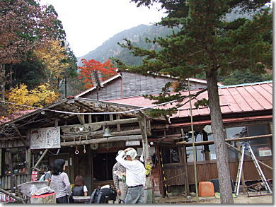 山頂一等三角点で昼食です。山頂は紅葉を楽しむ人達でいっぱいでした。 |