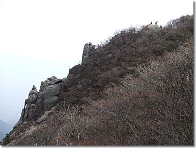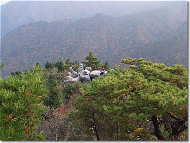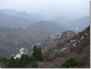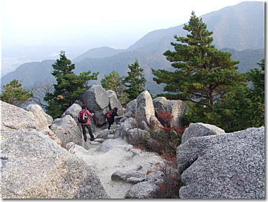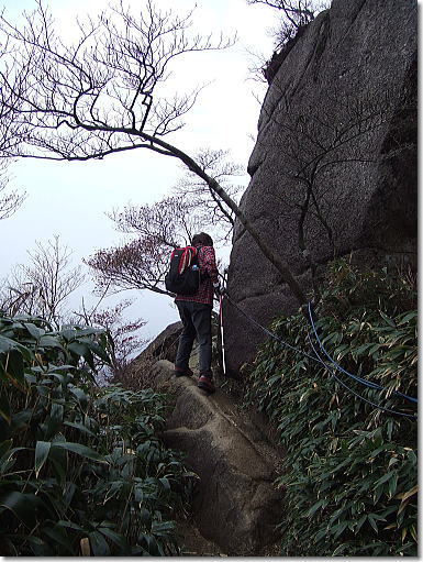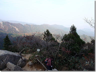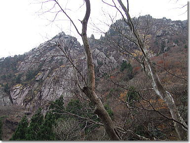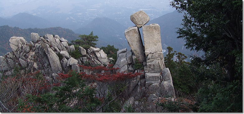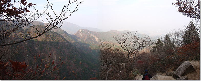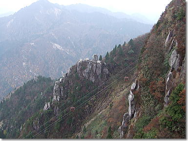 | 中道登山口へと下山開始です。樹林の中の急降下から始まり岩峰帯のクサリ場へと続く。鎖やロープに掴まり慎重に下山です。岩場の手前の展望は最高です。キレットを登りきると広い展望台にでる。中道のハイライトとも言うべきところで展望は申し分ない。奇岩、怪石を見ながらの下山となりました。 |